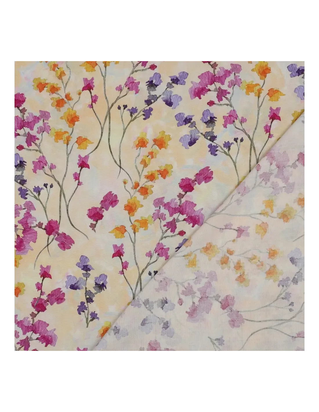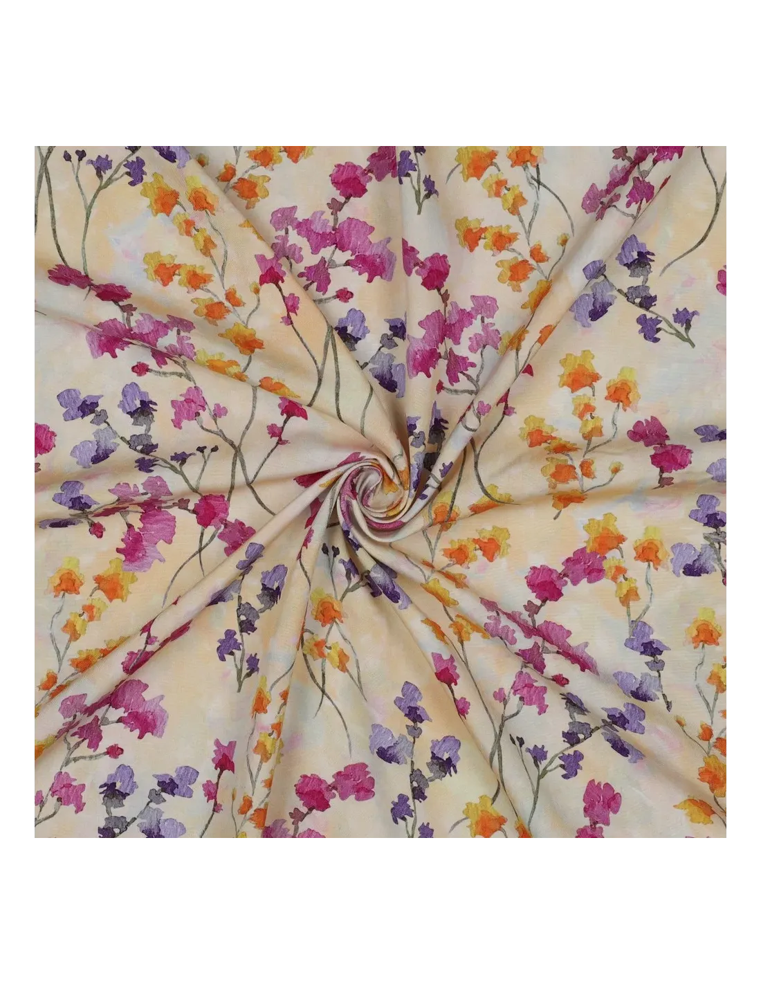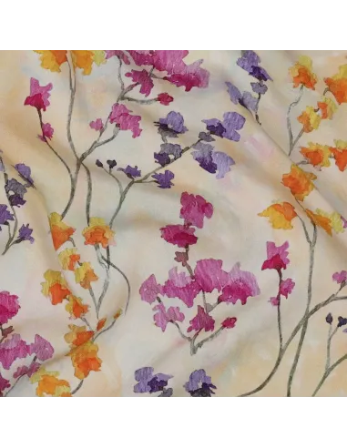 Découvrez la fluidité et l'élégance de cette viscose sublimée par une impression digitale d'une grande finesse. Laissez-vous séduire par ses motifs floraux, où les nuances de rose et de mauve se mêlent aux touches d'orange pour créer une composition délicate et lumineuse. Le tout repose sur un fond jaune clair qui apporte une douceur et une clarté incomparables.