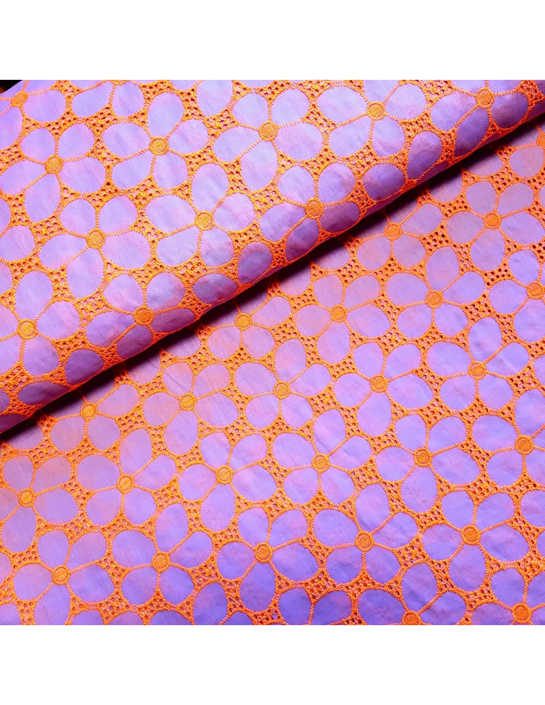Voile de coton mauve, brodé de motifs floraux orange vifs. C'est un tissu léger idéal pour confectionner un petit haut léger.