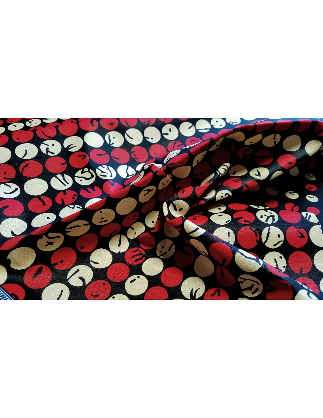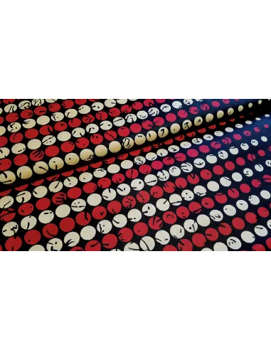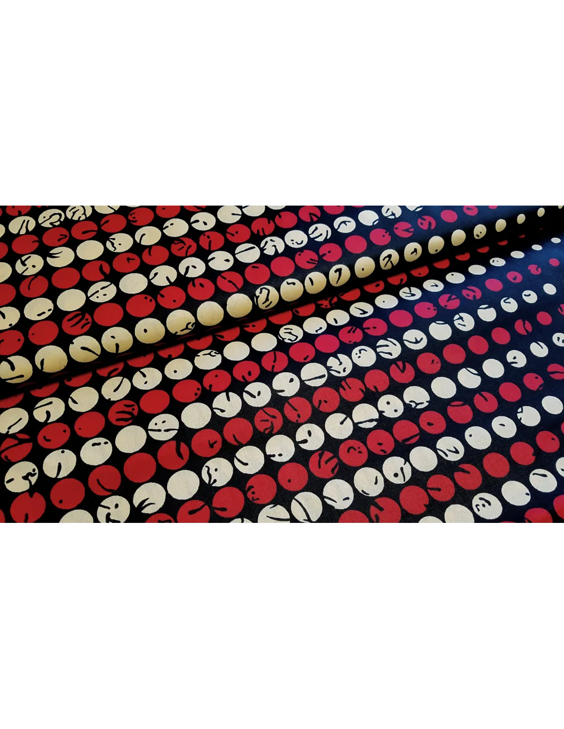 Superbe tissu wax d'une belle qualité avec de jolis motifs ronds sur fond noir. Ce tissu au subtil mélange de couleurs est idéal pour la confection de vêtements, accessoires…